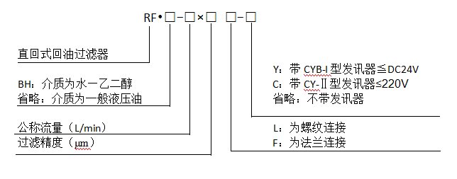 注:*為過濾精度,若使用介質為水—乙二醇,公稱流量160L/min,過濾精度10μm,帶CYB—I型發訊器,則過濾型號為RF•BH-160×10Y,濾芯型號為HL00160R010BN/HC。